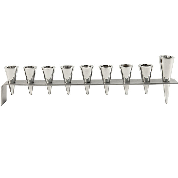 The Chanukiah is in the shape of an elongated metal frame with cone-shaped candle holders. This item is a perfect gift for Hanukkah, a Bar or Bat-Mitzvah, weddings, a new home, or any other Jewish simcha.