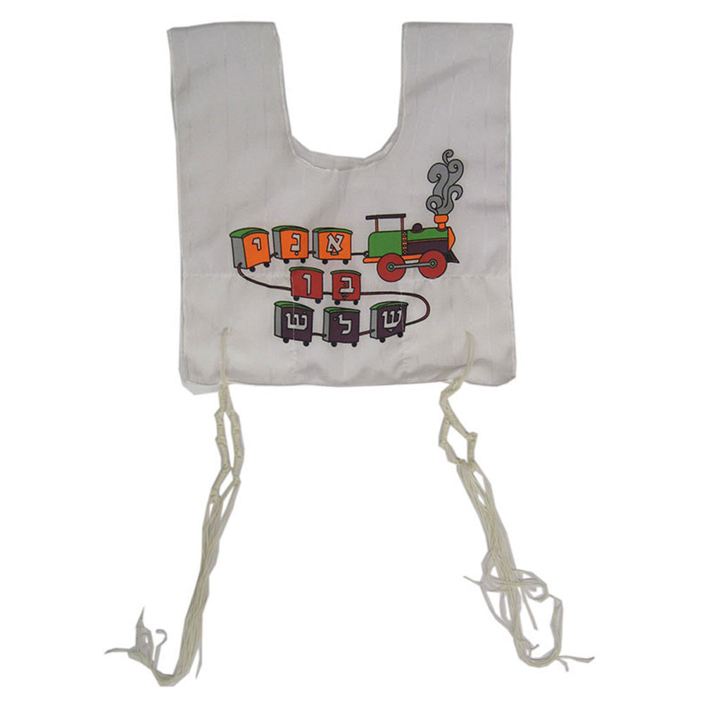 Round Neck Children's Tzitzit with a train pulling blocks reading "Ani Ben Shalosh" in Hebrew.