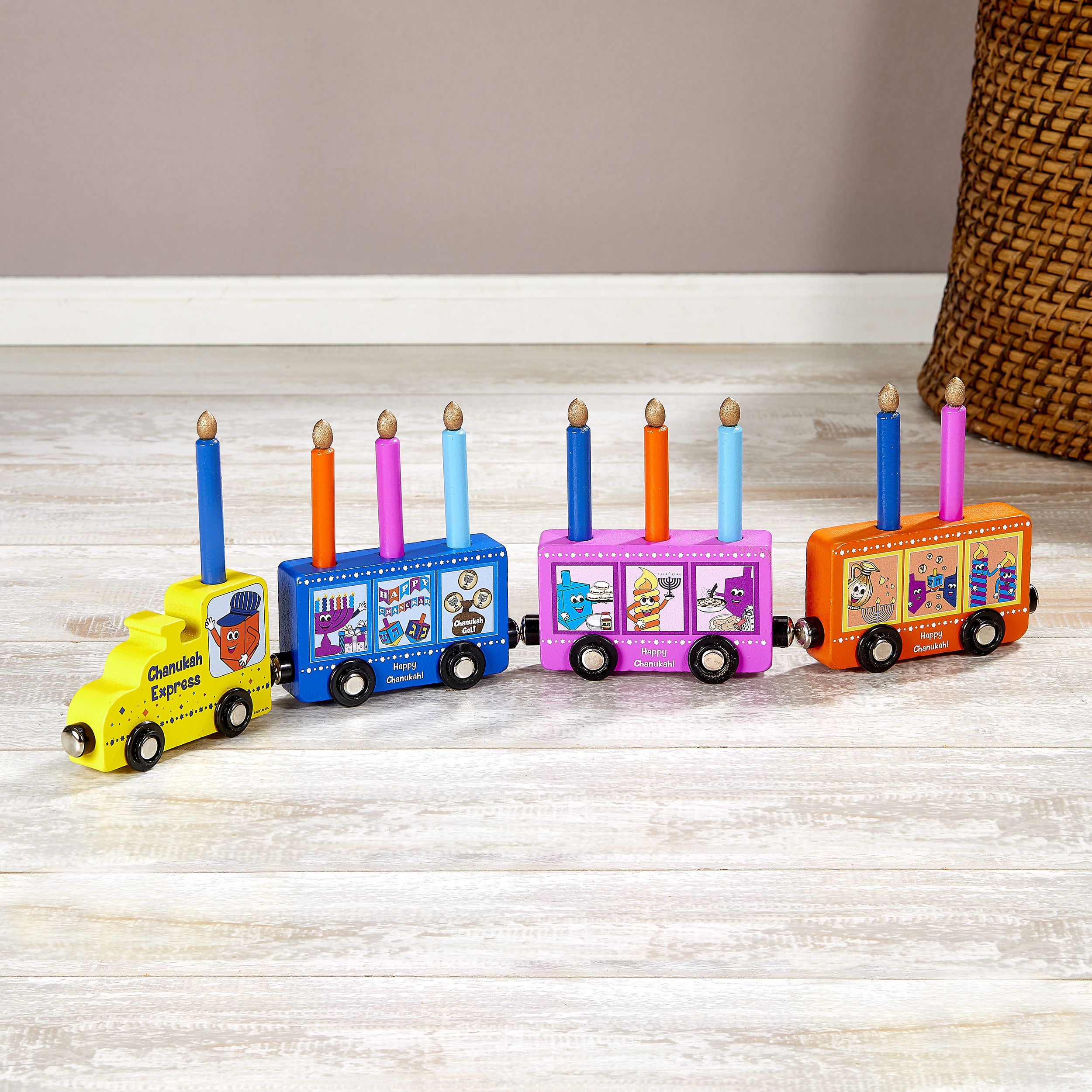 All aboard the Rite Lite Chanukah Express! This is the little train that can do Chanukah and provide kids with hours of fun and entertainment. Super fun and creative, the 4 cars connect with a magnet, allowing kids to "drive" the train, which carries play-wood candles for each night of Chanukah. Includes a pouch to conveniently store the wood candles for the next time you want to play!